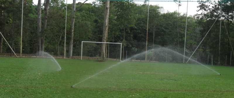 O sistema de irrigação automatizado no campo dois do CSM é composto de um controlador para válvulas solenóides, sendo estas interligadas à rede hidráulica e rede elétrica. Os sprinks (aspersores) são do tipo escamoteáveis adequadamente dispostos no terreno, de forma garantir uma homogeneização de precipitação.